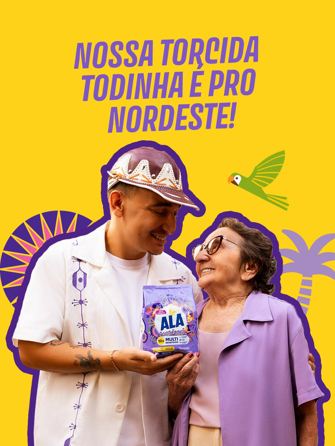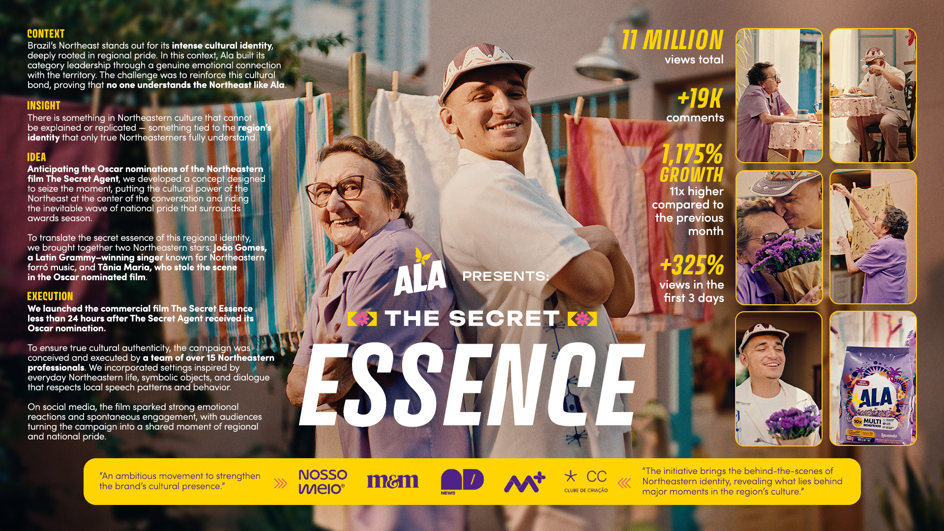 The Essência Secreta campaign for ALA celebrates northeastern identity by bringing together two cultural icons (Tânia Maria and João Gomes) to amplify regional pride through a 360º concept. Inspired by the idea that the true strength of the Northeast lies in its people, the project connects culture, memory, and authenticity to create a contemporary narrative that reinforces the emotional bond between brand and territory.